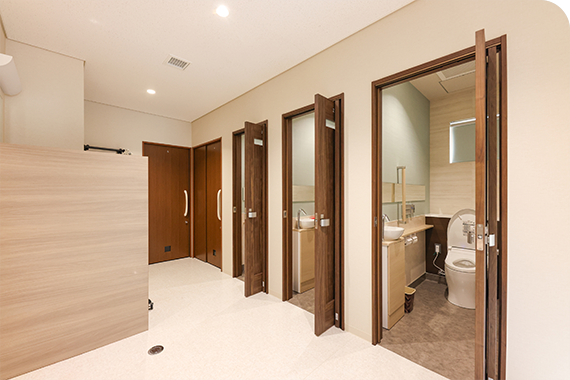 大腸内視鏡検査において、前処理の下剤に苦手意識を持たれるかたは多くいらっしゃいます。当院では、患者さんが少しでも楽に検査を受けられるよう、一人ひとりに対して個室トイレをご用意しております。専用の個室・特別室もございますので、リラックスした状態でお過ごしいただける環境です。
